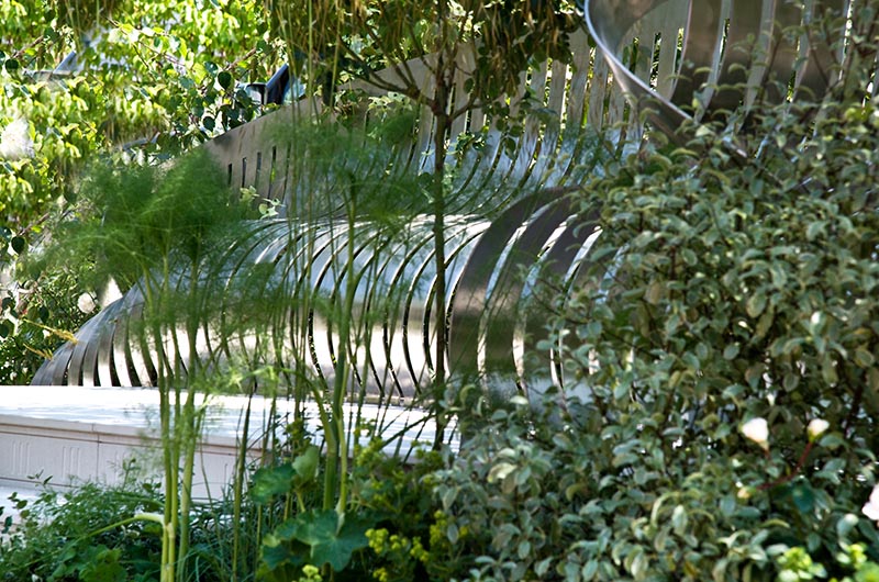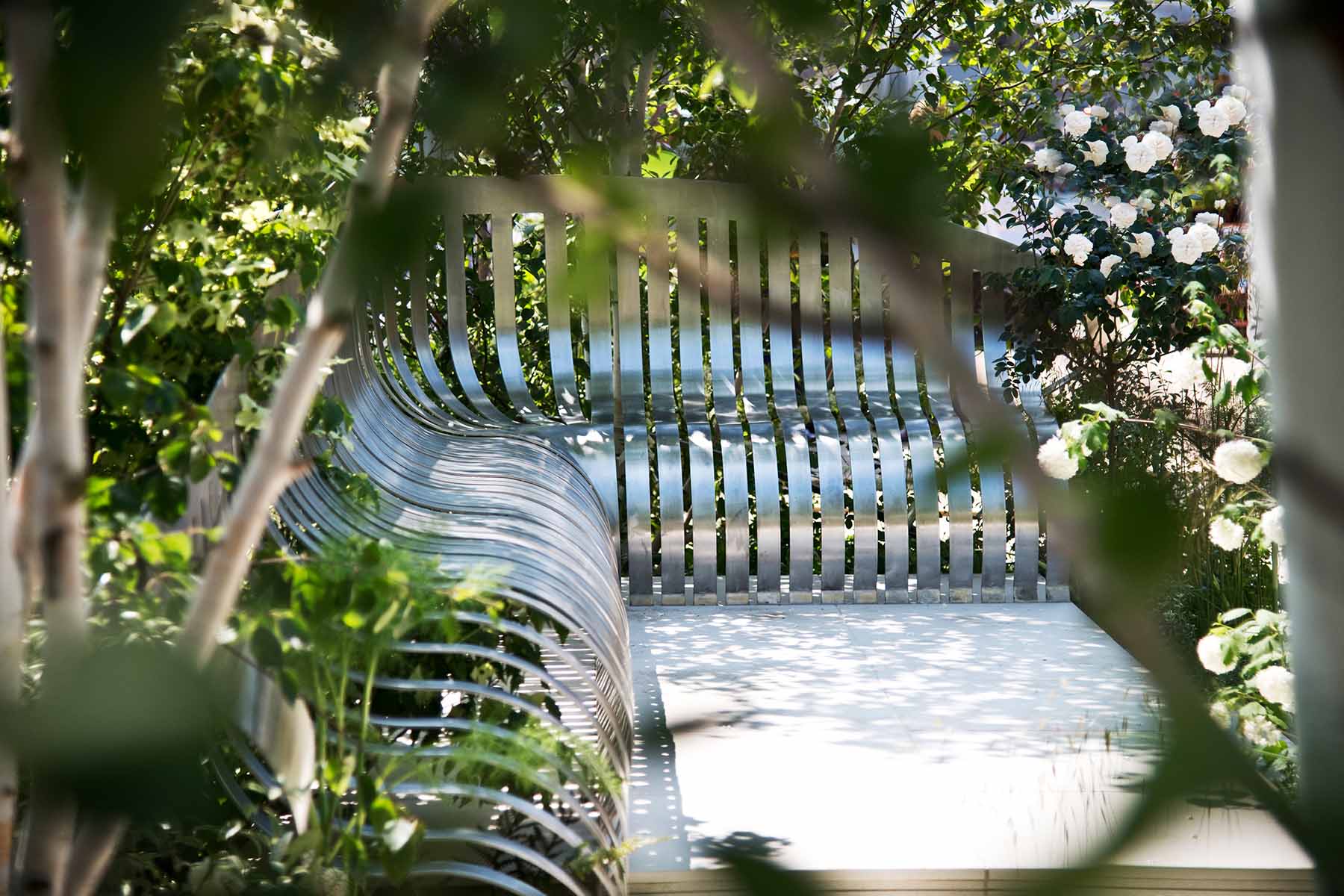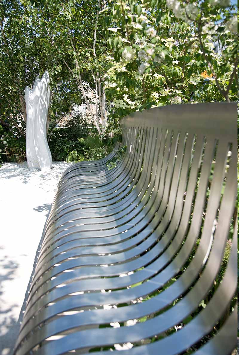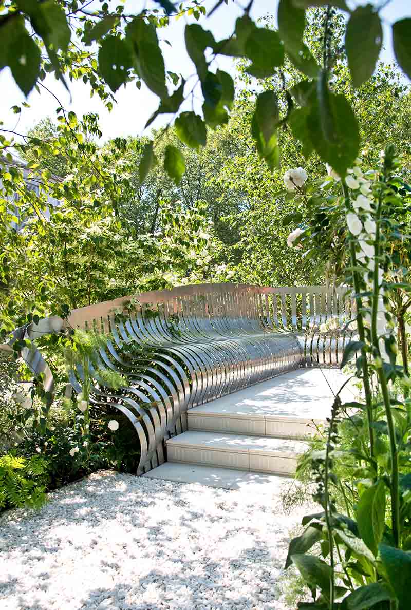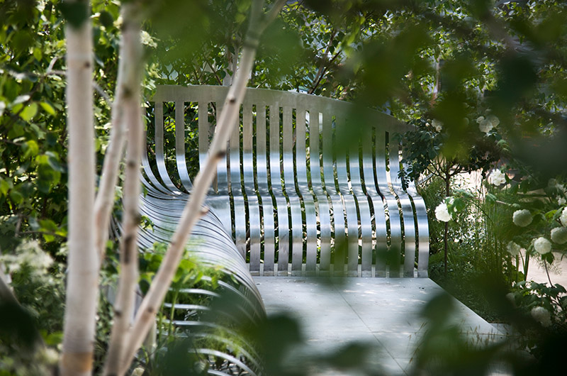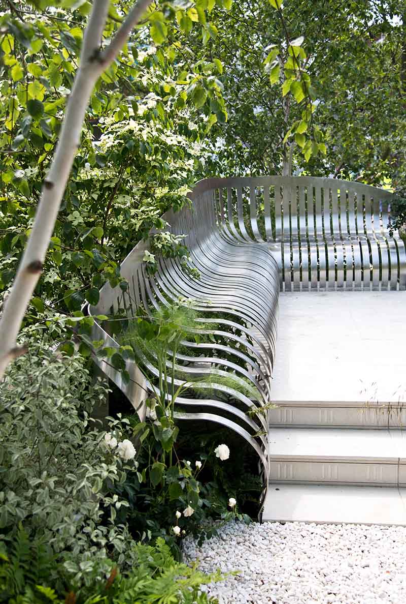 This elegant space is the corner of a London garden square. Drawing inspiration from the residential squares of the 19th century and continuing the tradition of great London squares, the design includes four multi-stem Betula utilis var. jacquemontii to create privacy and height. The marble sculpture by Frederic Chevarin reflects the colour of the trees.