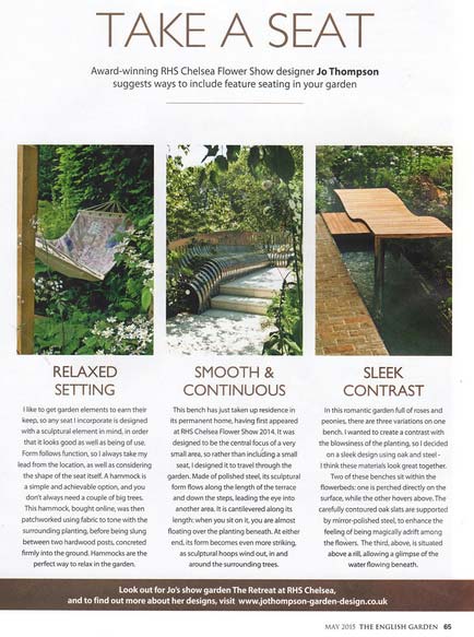 Award-winning RHS Chelsea Flower Show Designer Jo Thompson suggests ways to include feature seating in your garden.